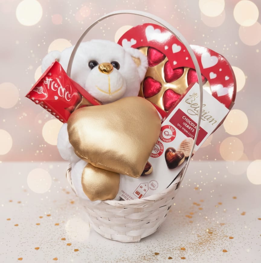 דובי פרווה חמוד בסלסלה עם מגוון שוקולדים . מתנה מושלמת ליום האהבה. מתנה לאישה.