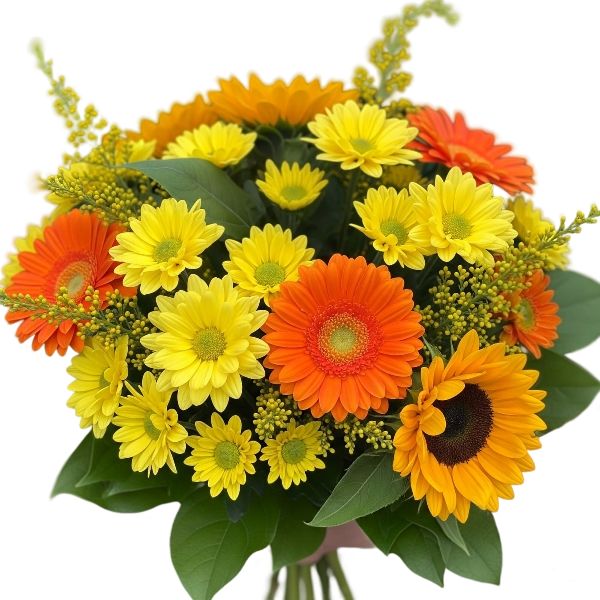 זר פרחים בצבעים חמים, עם חמניות עשירות, גרברות וחרציות ענף צהובות בתוספת עלי סלידגו וירק.