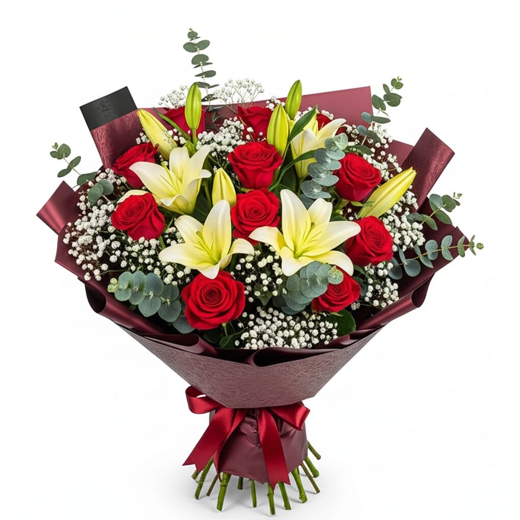 זר מליליות עשירות בגווני לבן או ורוד עם ורדים בורדו וירק יוקרתי בעטיפה איכותית.
