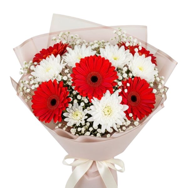 זר קלאסי עם חרציות וגרברות, עם גיפסנית וירק בעטיפה מהודרת.