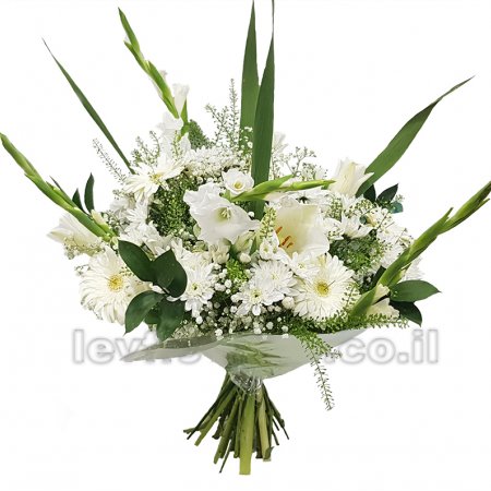 זר לבן טהור וצח, עשיר במגוון רחב של פרחים לבנים בלבד עם שושן צחור, חרציות , גרברה ,סייפנים וכול טוב.