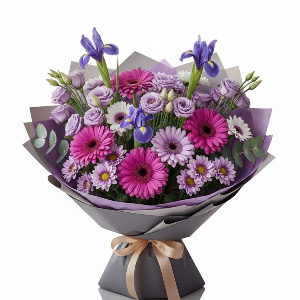 זר סגול מרהיב ומרשים עם מגוון פרחים בגווני סגול ולילך.