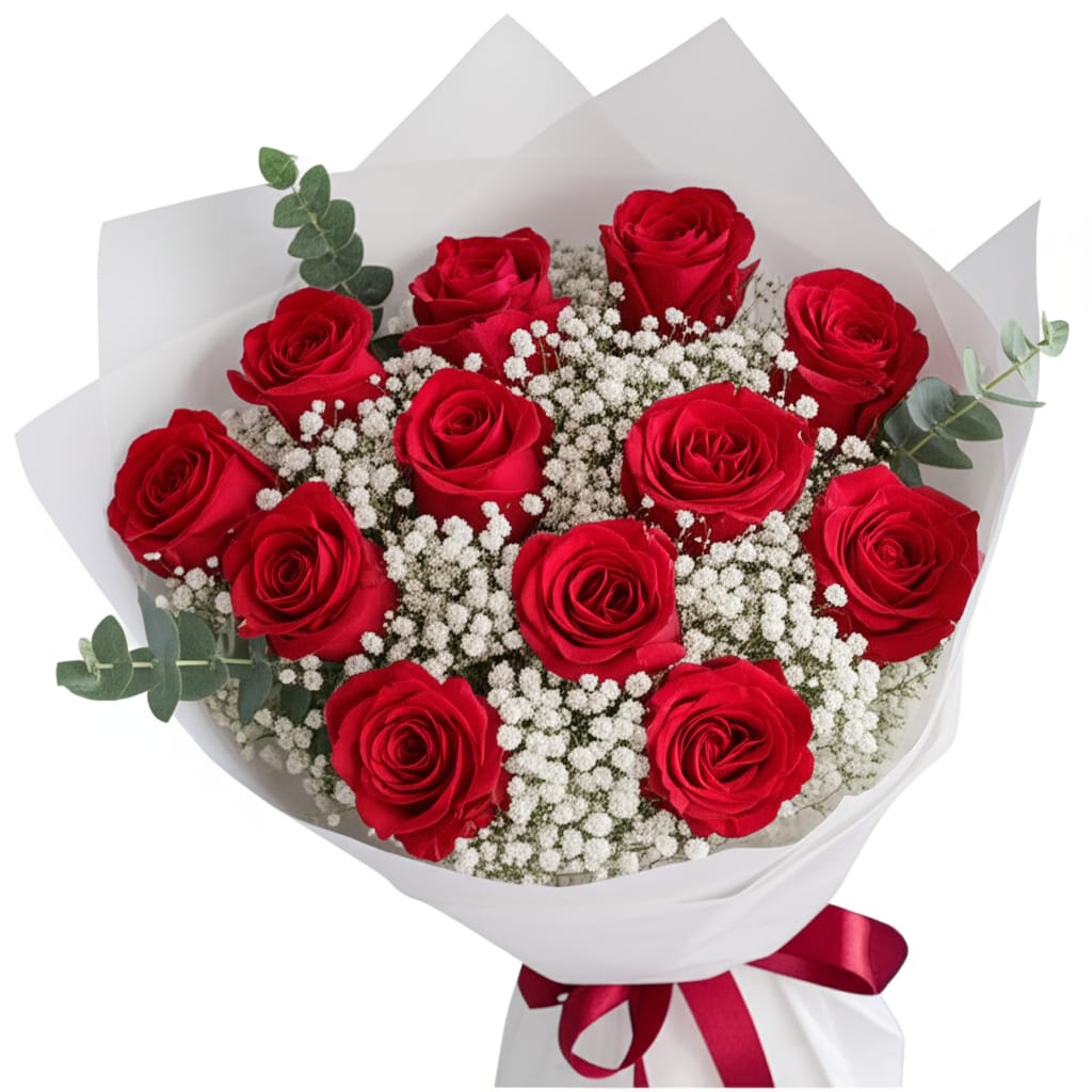 זר 11 ורדים אדומים בגוון בורדו Lovely Red, עשיר ומיוחד עם גיפסנית ואקליפטוס או ירק מפנק אחר שינפח את החוויה של הזר. זר שמתאים לאהובת ליבך ביום המיוחד שלה, זר שמשדר אהבה ורומנטיקה.