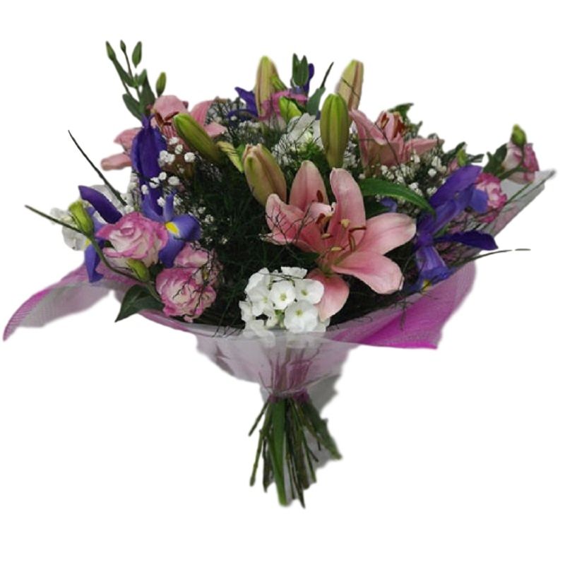 זר יפיפה בגווני סגול ,לבן וורוד מורכב מליזיאנטוס , פלוקס, בבונג,ליליות ,איריסים וגיספנית בעטיפת רשת יוקרתית.